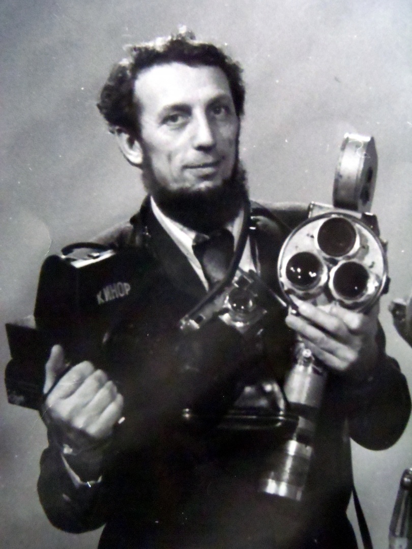 «Это коллега – кинооператор, с которым мы вместе работали, - Анатолий Проничев. Нам пришла новая аппаратура «Кино» - это отечественная техника. А в другой руке у него аппаратура из ГДР, мы лет 15 снимали на нее. Это 16-миллиметровая камера, хорошо сделанная, был дополнительный набор оптики, кассеты разной емкости. На 30 метров можно было снять только 2 минуты. Были еще дополнительные большие кассеты по 120 метров, на которые можно было снимать более продолжительные эпизоды. Российская аппаратура примерно так же комплектовалась, мы неплохо на ней работали».