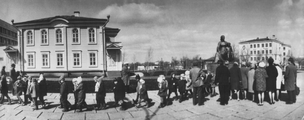 «Детей ведут на экскурсию в Ленинский мемориал. Тут и экскурсанты с теплохода, которых тогда в городе было очень много. В этом здании, в котором сейчас Квартира-музей В.И. Ленина, раньше была библиотека. За памятником – общежитие пединститута»., - вспоминает кинооператор, фотограф Борис Тельнов.