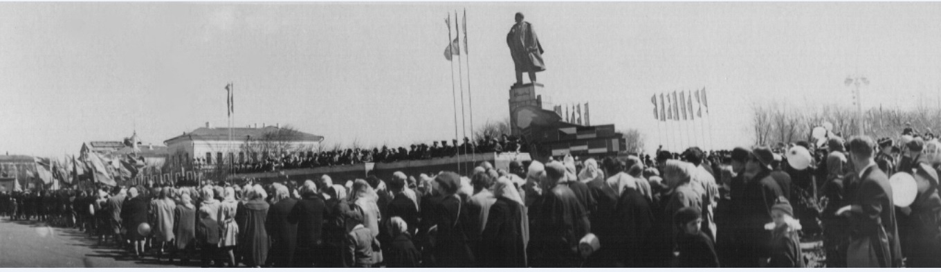 Ульяновск, площадь Ленина. Первомайская демонстрация. Проход делегаций. Снято панорамной камерой. 1960-е гг.