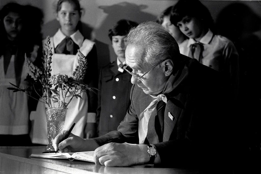 Председатель Совета министров СССР Алексей Косыгин оставляет запись в книге почетных посетителей «Музея-гимназии В.И. Ленина».