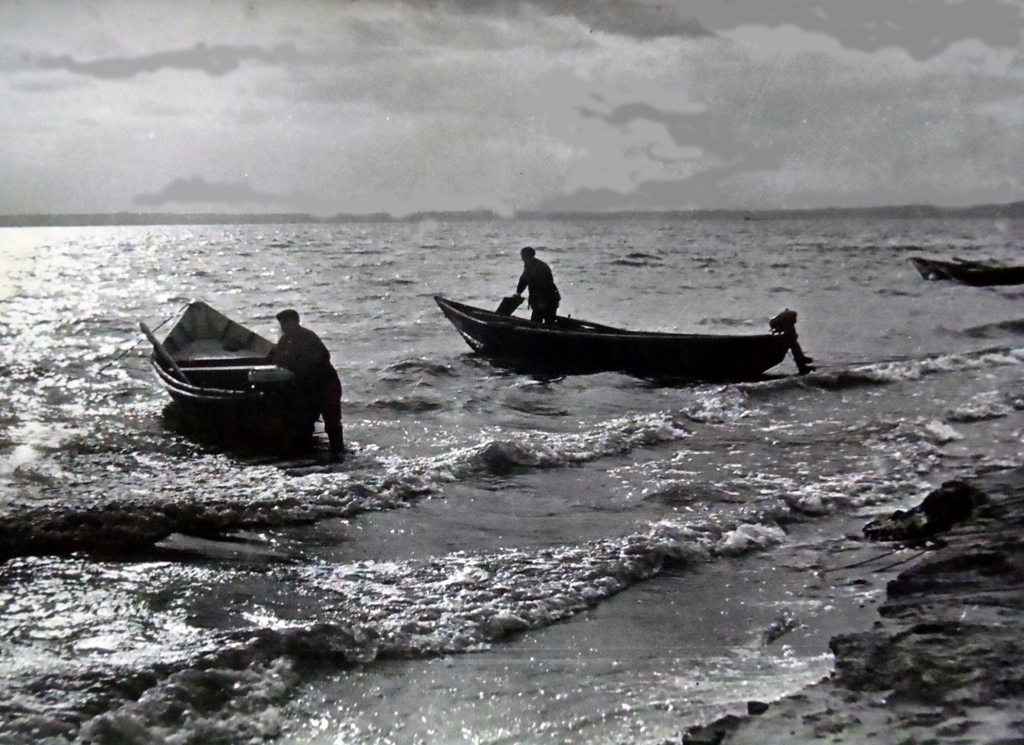 Штормит на водохранилище, колхоз «Белая рыбка», рыбаки. Ульяновская область, 1966 год.