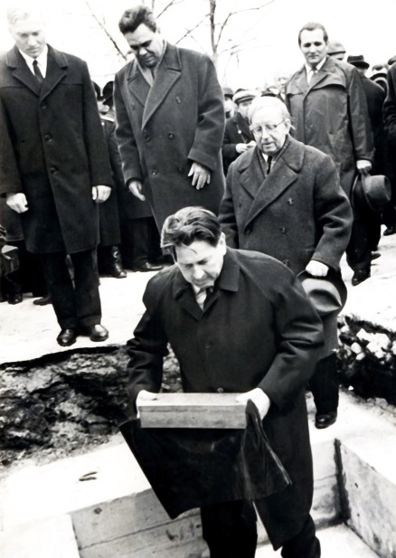 Первый секретарь Ульяновского обкома КПСС А.А. Скочилов подносит футляр с капсулой и Обращением к потомкам к месту закладки Ленинского мемориала на митинге, посвященном этому событию. Ульяновск. 22 апреля 1967 г.