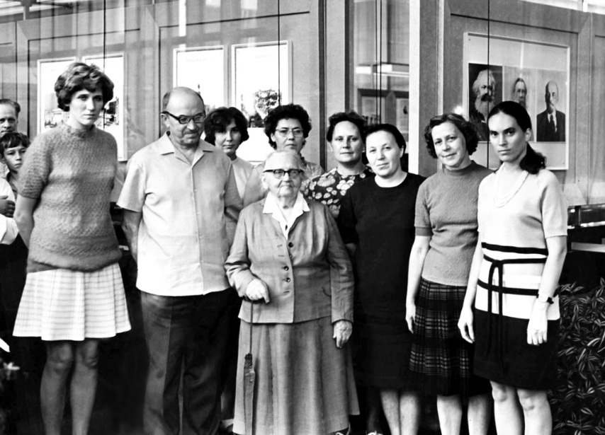 Сотрудники музея с хозяйкой последней конспиративной квартиры В.И. Ленина М.В. Фофановой в Ульяновском филиале Центрального музея В.И. Ленина. Слева направо: В.В. Преснякова, И.Я. Баранов, Т.В. Никитенко, М.В. Фофанова, З.А. Баннова, Н.М. Морозова, Л.Ф. Белокопытова, А.Д. Дернова, Л.П. Фатьянова. Ульяновск. 14 августа 1974 г.