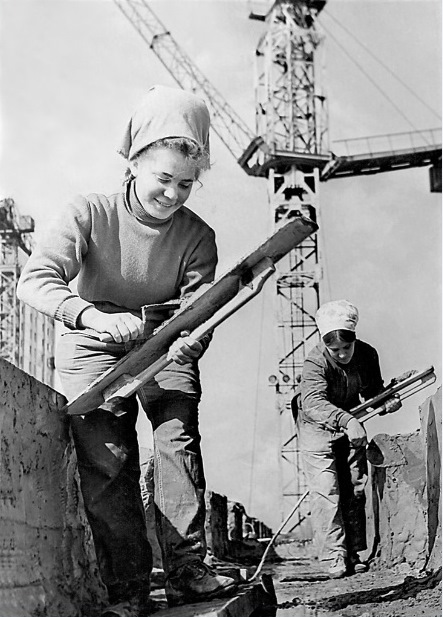 Девушки из комсомольско-молодежной бригады штукатуров заслуженного строителя РСФСР М.Д. Комаровой за работой на строительстве Ленинского мемориала