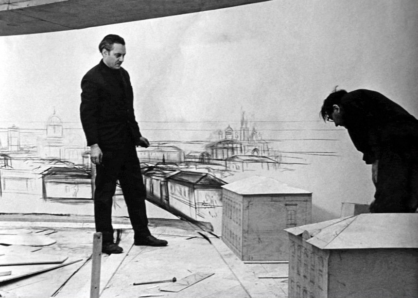 Народный художник РСФСР Е.И. Дешалыт за работой по созданию диорамы Симбирска второй половины XIX в. Ульяновск. 1969 г.