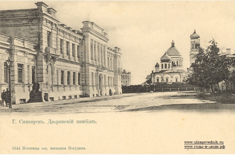 Симбирск, Дворянский переулок, Дворянский пансион-приют им. императора Николая II. 1903 года. В 1911 году пансион преобразован во вторую мужскую гимназию, с 1923 года здесь была школа, а также политехнические курсы с библиотекой. В 1932 году здесь открыт Педагогический институт им. И.Н. Ульянова (сегодня ульяновский государственный университет). На заднем плане - Троицкий собор (Соборная площадь)