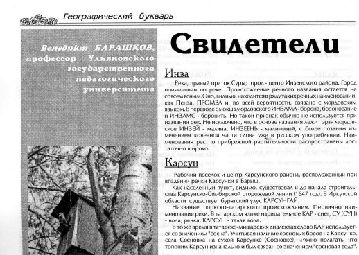 КАРСУН. Рабочий поселок и центр Карсунского района, расположенный при впадении речки Карсунки в Барыш. Как населенный пункт, видимо, существовал и до начала строительства Карсунско-Симбирской сторожевой линии (1647 год). В Иркутской области существует бурятский улус КАРСУНГАЙ. Название тюркско-татарского происхождения. Первично наименование реки. В татарском языке нарицательное КАР - снег, СУ (СУН) - вода, речка; КАРСУН - талая вола. В то же время в татарско-мишарских диалектах слово КАР используется со значением "сосна". Учитывая наличие сосновых боров на Карсунке, села Сосновка на сухой Карсунке (Сосновке), можно полагать, что топоним Карсун изначально и был связан со значением "сосновая вода".