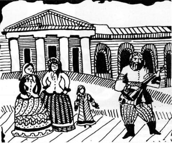 Слышится и привычный звук местной шарманки. Подрабатывает в толпе бедняга-музыкант с мальчиком-гимназистом и непременным попугаем. На стареньком коврике устраивается маленькое гимнастическое представление. А если в награду подадут гривенник, то шарманщик предложит взять билетик на "счастье" с предсказанием "судьбы". Вытащит его по приказанию хозяина "попка"...