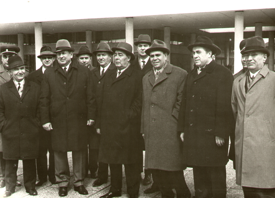 Генеральный секретарь ЦК КПСС Л.И.Брежнев среди руководителей Ульяновской области в день открытия Ленинского мемориала на площади 100-летия со дня рождения В.И.Ленина в г.Ульяновске. 16 апреля 1970 г.