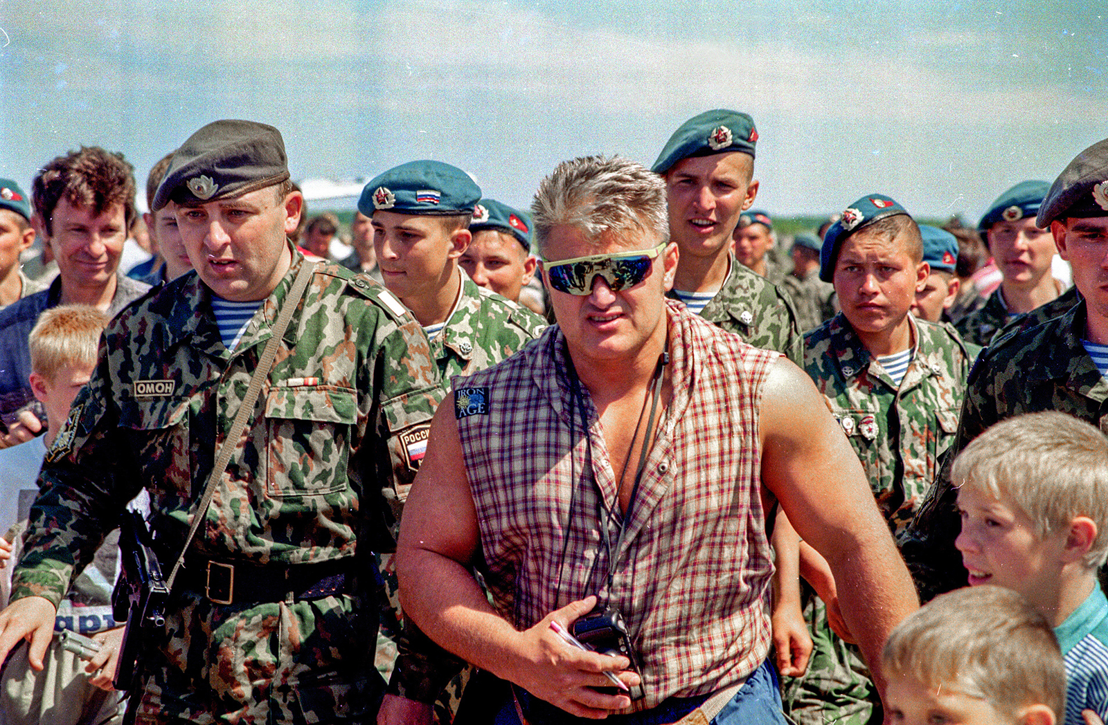 Владимир Турчинский (Динамит) - спортсмен, актёр и телеведущий, в сопровождении ОМОНа. Владимир Ламзин напечатал фотографию размером 50Х60 в цвете вручную, так как машины Kodak такой размер тогда не печатали, и подарил ему перед отъездом.