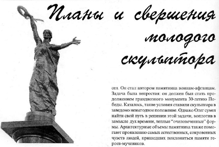 В первые же годы своего самостоятельного творчества Олег смог осуществить и другой свой замысел. Он стал автором памятника воинам-афганцам. Задача была непростая: он должен был стать продолжением грандиозного монумента 30-летаю Победы. Казалось, такие условия ставили скульптора в заведомо невыгодное положение. Однако Олег сумел найти свой путь в решении этой задачи, воплотив в замысле дух времени, теплые "очеловеченные" формы. Архитектурные объемы памятника также помогают проявлению самых естественных, сокровенных чувств людей, пришедших поклониться памяти героев-мучеников.