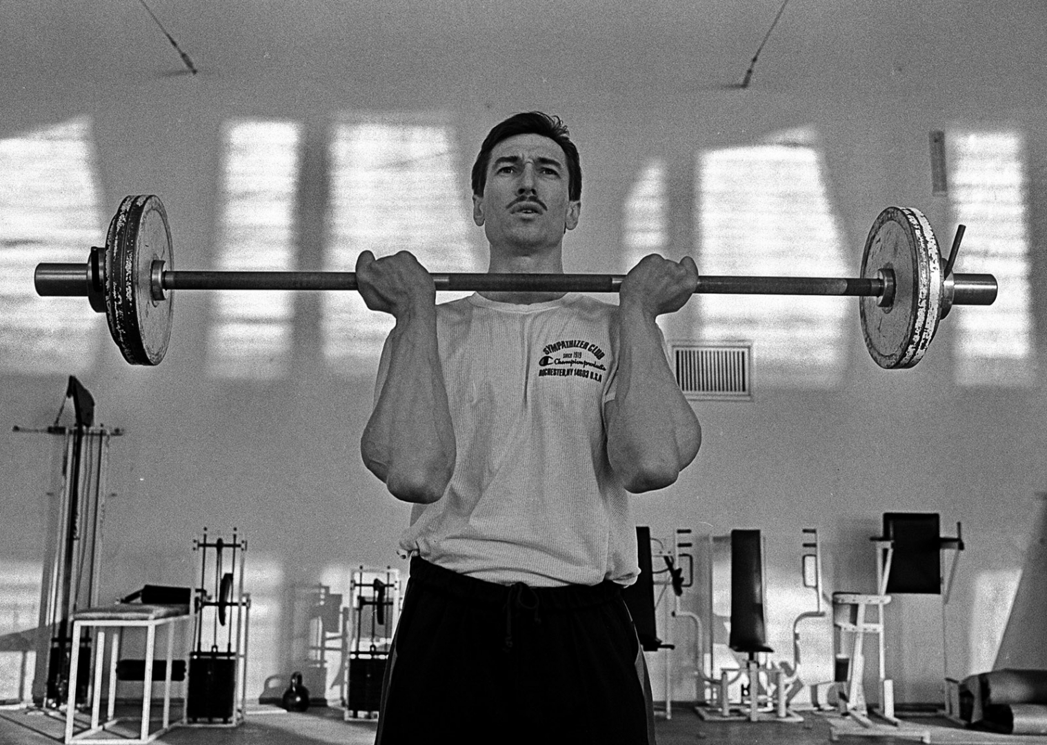 Олимпийский чемпион по лёгкой атлетике Владимир Крылов на тренировке в спортзале Ульяновского педагогического института.