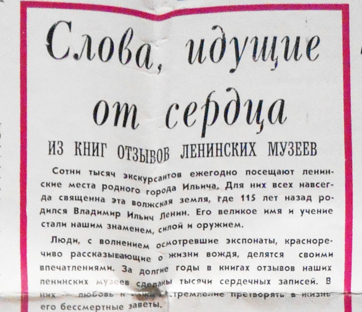Сотни тысяч экскурсантов ежегодно посещают ленинские места родного города Ильича. Для них всех навсегда священна эта волжская земля, где 115 лет назад родился Владимир Ильич Ленин. Его великое имя и учение стали нашим знаменем, силой и оружием. Люди, с волнением осмотревшие экспонаты, красноречиво рассказывающие жизни вождя, делятся своими впечатлениями. За долгие годы в книгах отзывов наших ленинских музеев - тысячи сердечных записей. В них любовь к вождю, стремление претворять в жизнь его бессмертные заветы.