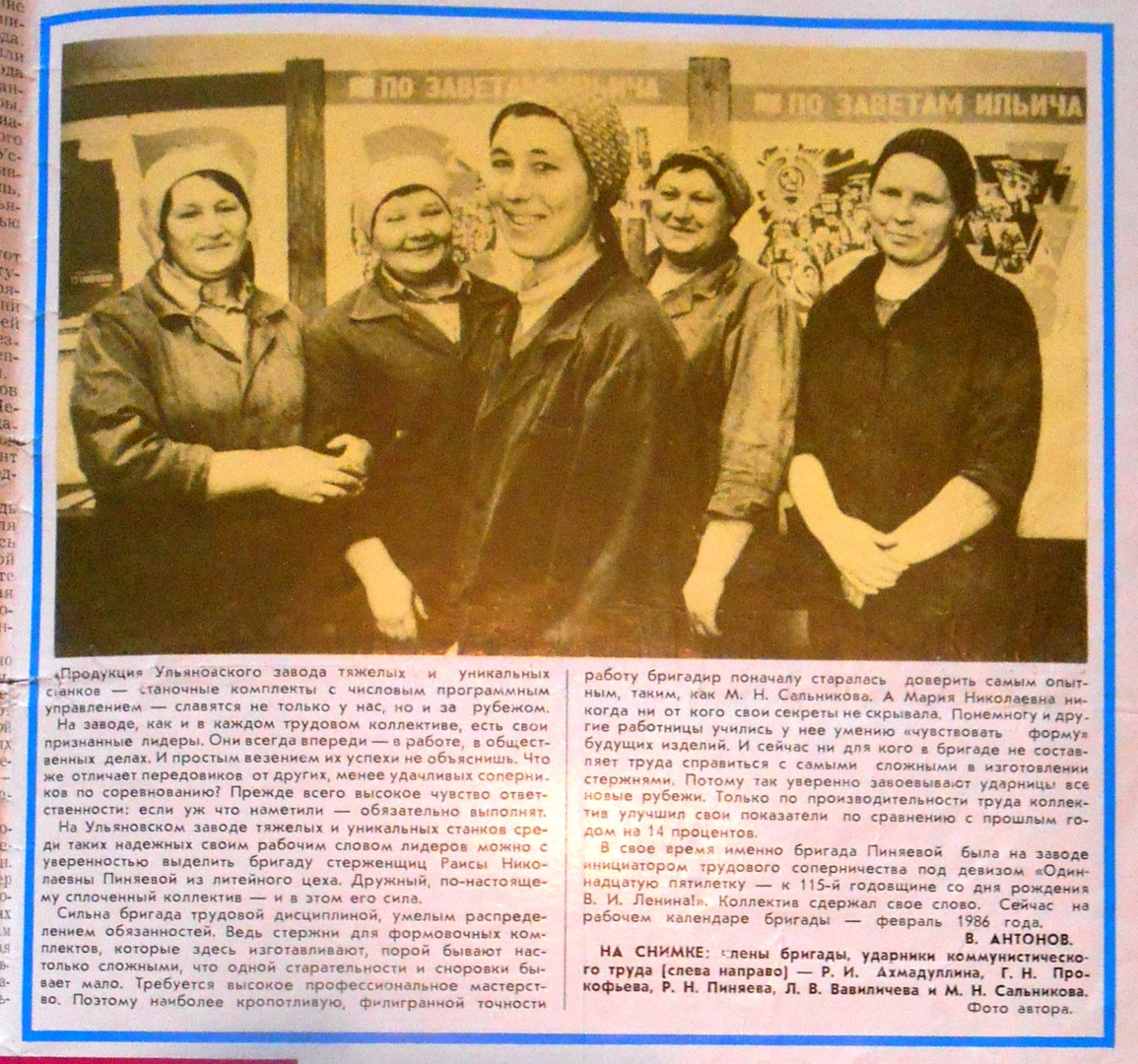 На Ульяновском заводе тяжелых и уникальных станков среди таких надежных своим рабочим словом лидеров можно с уверенностью выделить бригаду стерженщиц Раисы Николаевны Пимяевой из литейного цеха. Дружный, по-настоящему сплоченный коллектив - и в этом его сила. Сильна бригада трудовой дисциплиной, умелым распределением обязанностей. Ведь стержни для формовочных комплектов, которые здесь изготавливают, порой бывают настолько сложными, что одной старательности и сноровки бывает мало. Требуется высокое профессиональное мастерство. Поэтому наиболее кропотливую, филигранной точности работу бригадир поначалу старалась доверить самым опытным, таким, как М.Н. Сальникова.