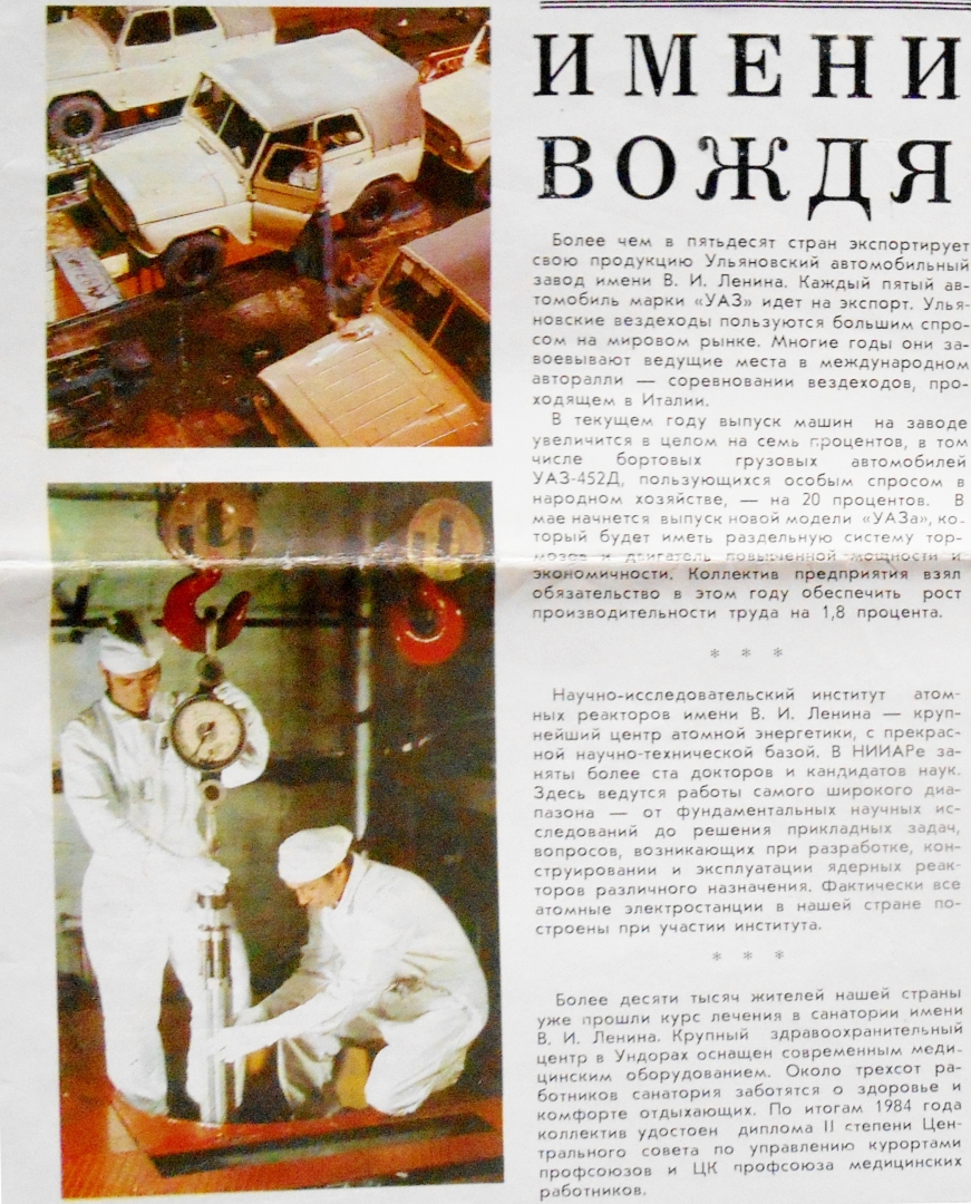 Более чем в пятьдесят стран экспортирует свою продукцию Ульяновский автомобильный завод имени В. И. Ленина. Каждый пятый автомобиль марки «УАЗ» идет на экспорт. Ульяновские вездеходы пользуются большим спросом на мировом рынке. Многие годы они завоевывают ведущие места в международном авторалли — соревновании вездеходов, проходящем в Италии.