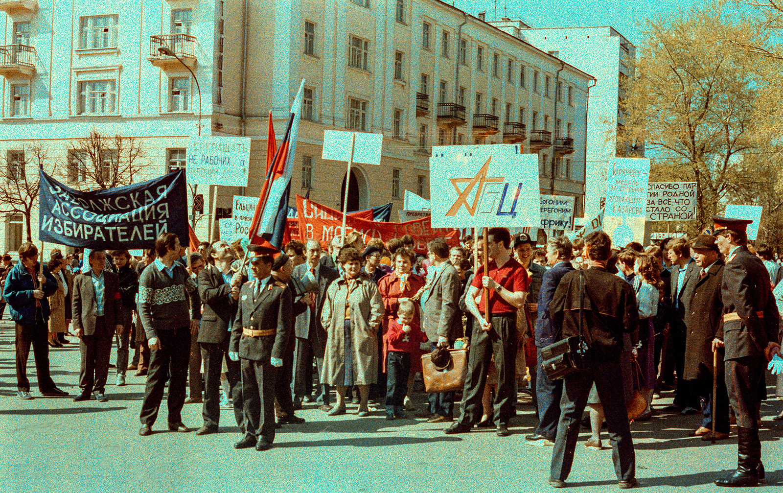 Демонстрация на улице Гончарова у гостиницы "Волга"
