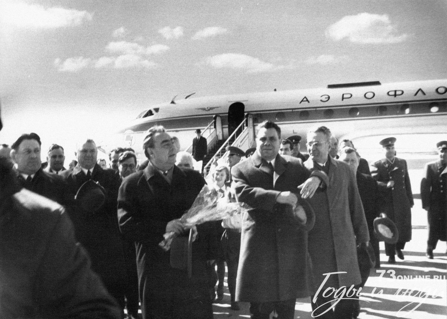 Л.И. Брежнева встречают участвующий в Международной встрече представителей рабочего и профсоюзного движения в Ульяновске член Политбюро ЦК КПСС, председатель ВЦСПС А.Н. Шелепин, член ЦК КПСС, первый секретарь областного комитета партии А.А. Скочилов, председатель исполкома областного Совета депутатов трудящихся В.П. Васильев, секретари обкома КПСС М.Н. Козлов, В.А. Полянсков, Е.В. Сазанов, В.Н. Сверкалов, первый секретарь Ульяновского горкома КПСС А.И. Кудрявцев, члены и кандидаты в члены бюро обкома КПСС, члены облисполкома, председатель исполкома Ульяновского горсовета Б.А. Ланцов и другие товарищи (...)