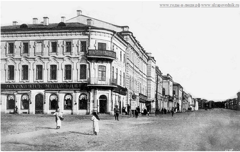 "Торговую часть города составляют: часть Большой Саратовской улицы, занимаемая гостинным двором и затем вся местность за речкой Симбиркой, заключающая в себе две большия площади: базарную и ярмарочную. В этой части сосредотачивается торговая деятельность города; здесь же живет и большинство купцов". Из книги П. Мартынова "Город Симбирск за 250 лет существования"