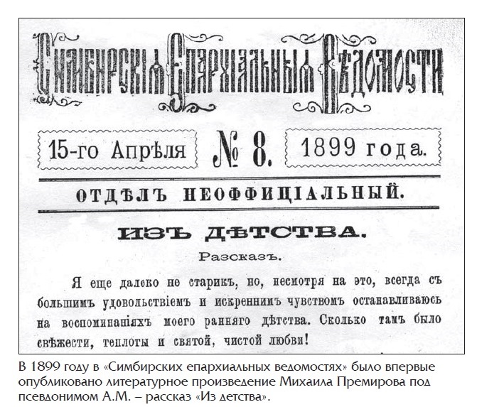 В 1890–1899 гг. Михаил Премиров проживал в Симбирске, учился на казённый кошт в духовном училище, затем в духовной семинарии, которую окончил по первому разряду. После окончания семинарии начинающий писатель служил псаломщиком в церкви села Елаур Сенгилеевского уезда, затем учительствовал в двухклассной церковно-приходской школе в селе Петропавловском Самарского уезда. В августе 1901 года он прерывает учёбу из-за участия в студенческих волнениях и увлечения литературным творчеством. Поселившись в Саратове, где жила его сестра, становится корреспондентом волжских и столичных газет и журналов.