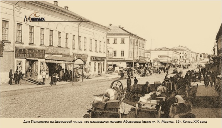 Известны три адреса в Симбирске, по которым располагались магазины под маркой Абушаевых. Первый, старейший – на улице Дворцовой, на первом этаже в доме Пожарского, его вывеска «Магазин Шамшетдина Абушаева» хорошо видна на фотографии начала ХХ века.