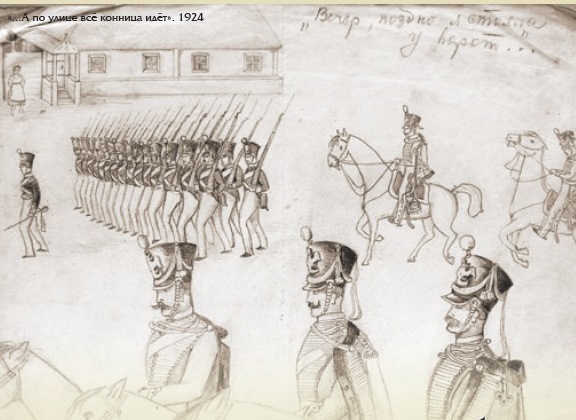 Автор заставляет нас услышать песни Гражданской войны. Не те, массово звучащие из радиоприёмников и с экранов телевизоров в стране победившего социализма, приукрашенные, отредактированные, не допускающие никаких сомнений. Нет, это были другие песни. Их пели на один мотив и «красные», и «белые», они уходили в народ и жили по законам фольклора. Забытые слова забытых песен оживают в рисунках, становятся подписями и названиями. Несколько набросков иллюстрируют «Шарабан» – песню, которая стала частью истории Гражданской войны. О её распространённости свидетельствуют многочисленные мемуары. Возникший на основе одноимённой песни из репертуара цыганских хоров, появившийся незадолго до революции 1917 года, «Шарабан» стал боевой песней Народной армии Комуча, достался в наследство колчаковцам. Под пение «Шарабана» ходили в атаку пехотные части, одну из моделей артиллерийского орудия «белые» прозвали «шарабаном».