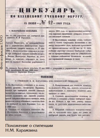 1. С Высочайшего соизволения и в память симбирского уроженца, историографа Карамзина, учреждается при Симбирской гимназии стипендия из процентов с капитала, составленного из пожертвований служащих при дирекции училищ Симбирской губернии и некоторых частных лиц, собравшихся по поводу юбилейного торжества, бывшего в Симбирске в честь Карамзина 1-го декабря 1867 года.