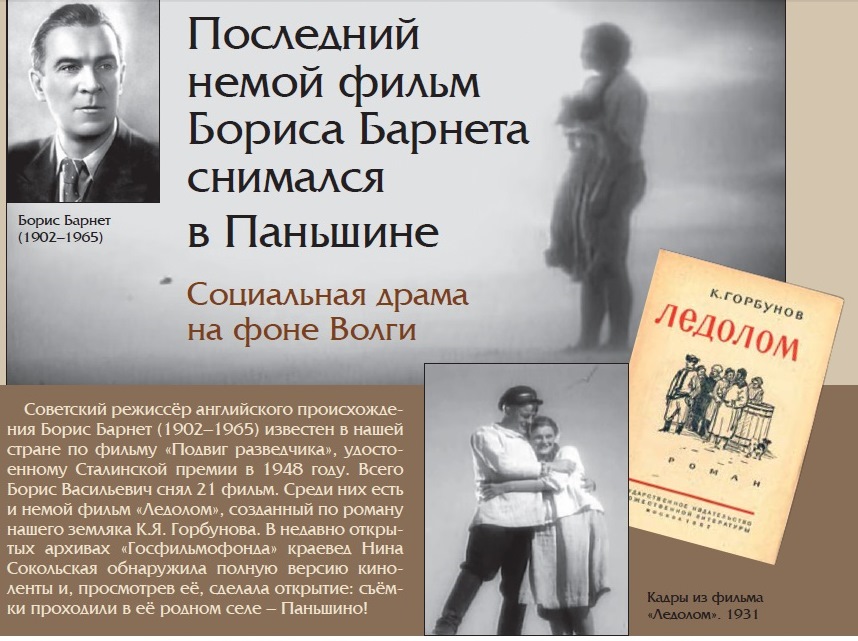Советский режиссёр английского происхождения Борис Барнет (1902–1965) известен в нашей стране по фильму «Подвиг разведчика», удостоенному Сталинской премии в 1948 году. Всего Борис Васильевич снял 21 фильм. Среди них есть и немой фильм «Ледолом», созданный по роману нашего земляка К.Я. Горбунова. В недавно открытых архивах «Госфильмофонда» краевед Нина Сокольская обнаружила полную версию киноленты и, просмотрев её, сделала открытие: съёмки проходили в её родном селе – Паньшино!