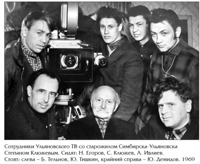Сотрудники Ульяновского ТВ со старожилом Симбирска-Ульяновска Степаном Клюжевым. Сидят: Н. Егоров, С. Клюжев, А. Ивлиев.Стоят: слева – Б. Тельнов, Ю. Тишкин, крайний справа – Ю. Демидов.