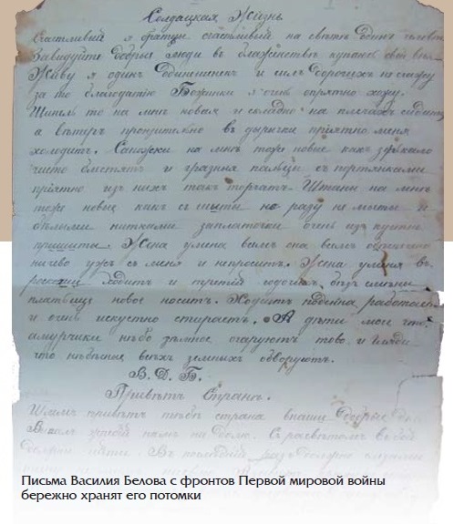 Василий Дмитриевич родился в 1884 году, был мужем прапрабабушки Новожениной Анны Алексеевны. В качестве денщика находился на военной службе под началом «лихого генерала» Свидерского в гвардейской бригаде Измайловского полка, которая вышла в поход из Петрограда на Люблин. В своих записях Белов рассказывает о тяжести и жестокости войны.