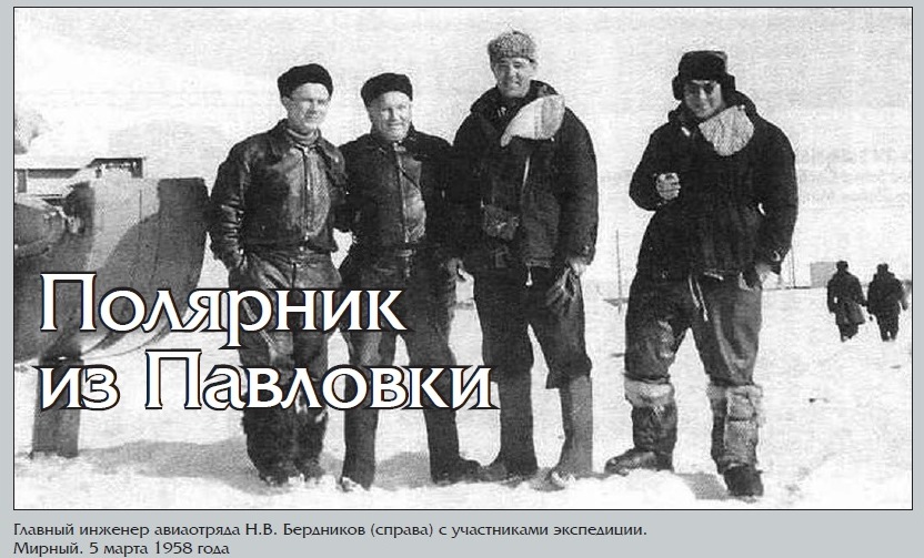 В 2001 году в журнал «Мономах» пришло письмо от ветерана-полярника Н.В. Бердникова из Краснодара. Он, уроженец р.п. Павловка Павловского района Ульяновской области, посвятил свои активные трудовые годы исследованию Антарктиды. Однако писал Николай Васильевич не о себе, а о нашем земляке А.Ф. Трёшникове, уроженце села Павловки Барышского района. Тогда мы впервые опубликовали в нашем журнале материал о знаменитом исследователе Арктики и Антарктики, президенте Географического общества СССР с 1997-го по 1991 год. И вот сейчас, в 2016 году, в редакцию пришло письмо, посвящённое самому Н.В. Бердникову, от Елены Борковской, внучки его сестры, которая много рассказывает о нём, хранит его письма, фотографии.