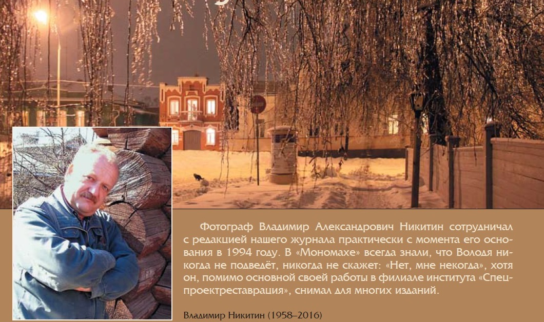 Фотограф Владимир Александрович Никитин сотрудничал с редакцией нашего журнала практически с момента его основания в 1994 году. В «Мономахе» всегда знали, что Володя никогда не подведёт, никогда не скажет: «Нет, мне некогда», хотя он, помимо основной своей работы в филиале института «Спецпроектреставрация», снимал для многих изданий.