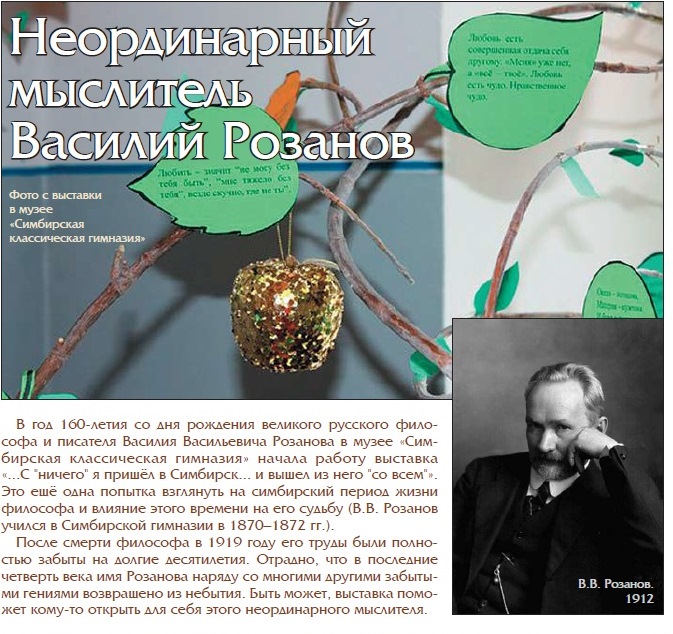 В год 160-летия со дня рождения великого русского философа и писателя Василия Васильевича Розанова в музее «Симбирская классическая гимназия» начала работу выставка «...С "ничего" я пришёл в Симбирск... и вышел из него "со всем"». Это ещё одна попытка взглянуть на симбирский период жизни философа и влияние этого времени на его судьбу (В.В. Розанов учился в Симбирской гимназии в 1870–1872 гг.).