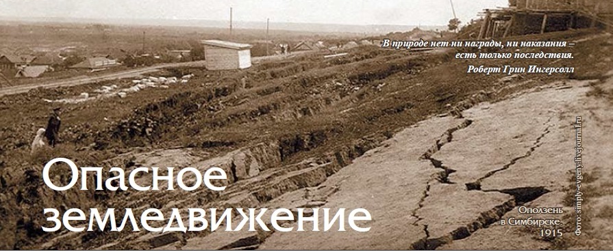 «В таком относительно спокойном и устойчивом положении правый берег в Симбирске мог находиться неопределённо долгое время, и только от времени до времени на нём могли возникать разрушительные явления оползней и сбросов, преимущественно же вмешательством человека. К числу таких причин должно быть отнесено состоявшееся в последнее время проведение здесь по нижней части склона этого берега пристанской ветки железной дороги».