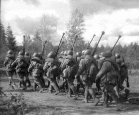Красноармейцы в шинельных скатках выдвигаются к полю боя