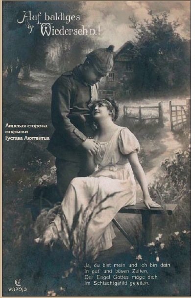Обычно открытки с таким посвящением направлялись на фронт, а не с фронта. Значит, у Густава Люттвитца был мотив отправить именно эту открытку, может быть, перед отправкой на русский фронт он также прощался с любимой Бертой Цинер. Дальнейшая судьба Густава и Берты неизвестна.