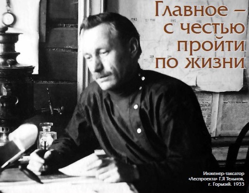 «Это был плодотворный период его работы и жизни нашей семьи, – считает Борис Григорьевич Тельнов. – Отец был погружён в работу. Мать, выросшая в трудолюбивой крестьянской семье, сразу занялась огородничеством, завела козу, корову, гусей, кур. В семье появился продуктовый достаток. И я, и сестра ходили в школу. Летом собирали ягоды, грибы, заготавливали сено. В отпуске отец брал нас с собой на Ветлугу в Крутогорское лесничество. Для нас, детей, это было беззаботное, радостное детство со счастливыми родителями. Наступил трагический 1941 год.Помню, 22 июня стоял тёплый солнечный день. Я прибежал с речки, где купался и пас гусей.