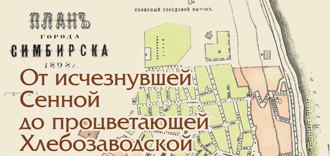 Одно из самых старых, ныне исчезнувших названий, – Сенная площадь. Оно существовало до начала XIX века и связано с городской территорией, на которой хранилось или продавалось сено. В Симбирске было три таких площади: 1) место у северной стороны Кремля, используемое в этих целях в XVII–XVIII вв. и от которого к р. Симбирке шла Сенная ул., ныне улица Д. Ульянова, 2) восточная часть Александровской площади у Лисиной улицы, ныне территория торгового центра и легкоатлетического манежа «Спартак», 3) место в южной части Ярмарочной площади, где находились сенные лабазы, ныне южная часть территории АО «Утёс» (бывшего приборостроительного завода).