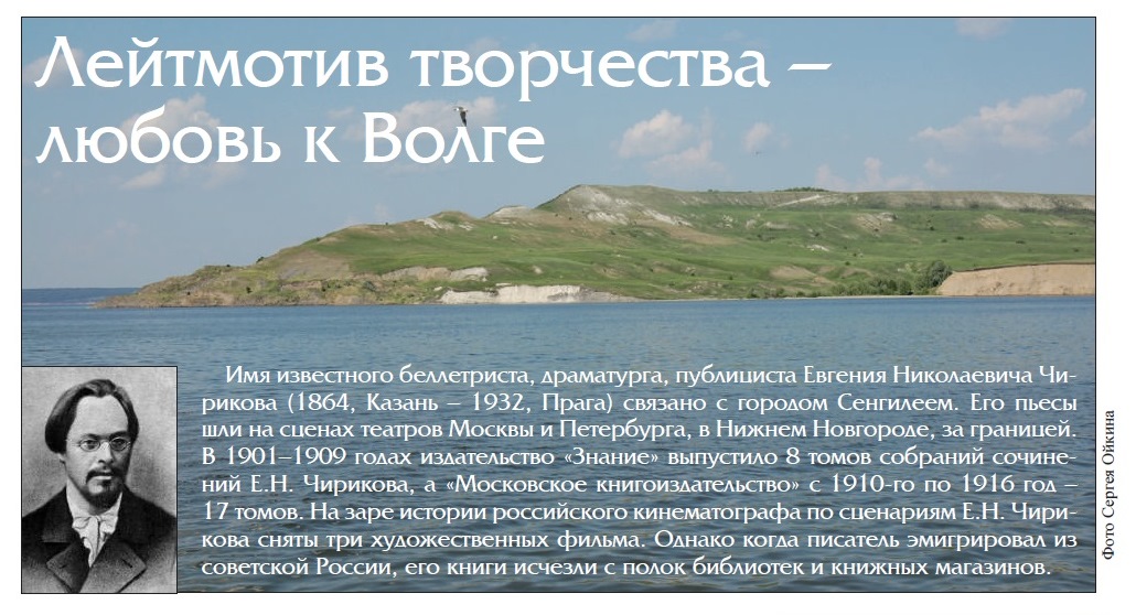 Имя известного беллетриста, драматурга, публициста Евгения Николаевича Чирикова (1864, Казань – 1932, Прага) связано с городом Сенгилеем. Его пьесы шли на сценах театров Москвы и Петербурга, в Нижнем Новгороде, за границей. В 1901–1909 годах издательство «Знание» выпустило 8 томов собраний сочинений Е.Н. Чирикова, а «Московское книгоиздательство» с 1910-го по 1916 год – 17 томов. На заре истории российского кинематографа по сценариям Е.Н. Чирикова сняты три художественных фильма. Однако когда писатель эмигрировал из советской России, его книги исчезли с полок библиотек и книжных магазинов.