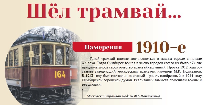 Такой трамвай вполне мог появиться в нашем городе в начале XX века. Тогда Симбирск вошел в число городов (всего их было 47), где предполагалось строительство трамвайных линий. Проект 1912 года составил заведующий московским трамваем инженер М.К. Поливанов. В 1913 году был составлен эскизный проект, одобренный в 1914 году Симбирской городской думой. Реализации замысла помешали войны и революции.