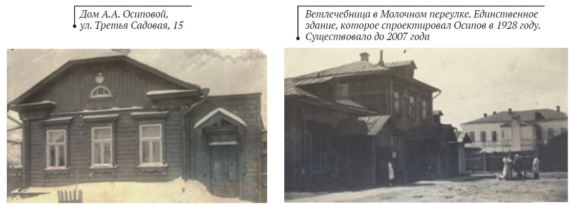 5 Документы с проектами домов К.А. Осипова находятся в Госархиве Ульяновской области (фонд Городской управы, № 137). Дело о разрешении С.С. Бокоунину, для которого был спроектирован известный теремок на ул. Мартынова (ныне Радищева), постройки дачного дома в Колках. Колками называлась местность на склоне Волги левее Смоленского (Рылеевского спуска) до Ленкоранского спуска вниз от Новых Казарм (23 июня 1912). Дело о разрешении строительства флигеля Волковой (вероятно, жене главы города) по Старо-Казанской (Красноармейской) улице дом 72 (22 июня 1913). Дело о разрешении Т.С. Смирнову постройки дачи в Колках (18 мая 1913). Дело о разрешении постройки дачи в Колках А.К. Яхонтову (2 мая 1914).