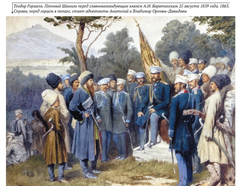 В августе 1859-го они были свидетелями и участниками сдачи имама Шамиля, окруженного русскими войсками в горном ауле Гуниб. Когда предводитель горцев показался перед главнокомандующим, генерал-фельдмаршалом князем Александром Ивановичем Барятинским, русские солдаты приветствовали его криками «Ура!»: таково было уважение к Шамилю по обе стороны фронта. Юные графы Орловы-Давыдовы состояли адъютантами при легендарном главнокомандующем, приходившимся им родным дядей!