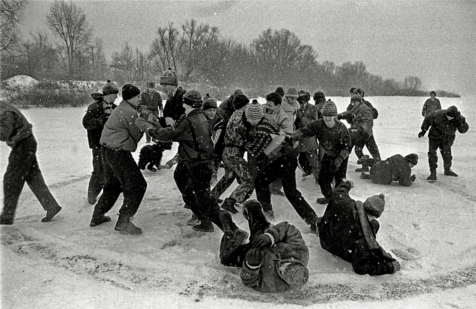 "На снимке - кулачные бои на Свияге, там, где пешеходный мост напротив Автомеханического техникума. Спортсмены-борцы устраивали для себя такую забаву вместо тренировки, конечно, по правилам, лежачих не били", - рассказал автор снимка - Владимир Ламзин.