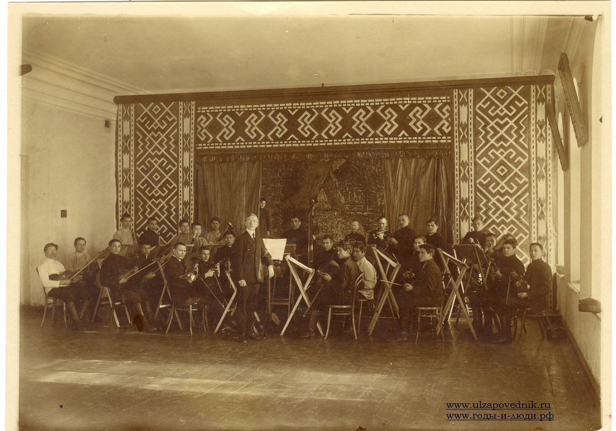 Симфонический оркестр Симбирской чувашской учительской школы на фоне декорации к постановке оперы М.И. Глинки «Иван Сусанин». В центре – руководитель Максимов Степан Максимович.