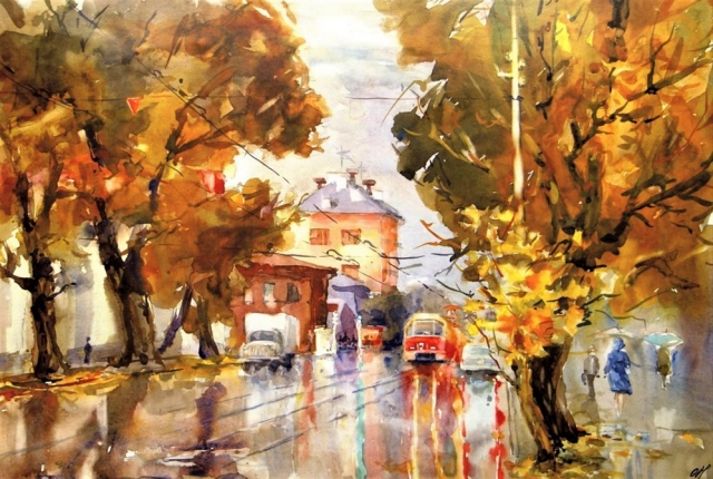 Н.П. Облезин. Улица Ленина. Дождливо. Картина экспонировалась на зональной выставке «Большая Волга» в 1969 году. Акварель