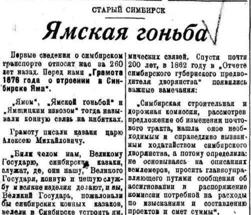Так было положено начало первой «Ямской гоньбе» в Симбирске. Характерно, что уже тогда в грамоте проскальзывает мысль, что дороги нужны для вывоза товаров.