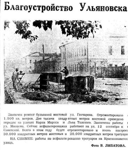 Закончен ремонт булыжной мостовой ул. Гончарова. Отремонтировано 1.500 кв. метров. Две тысячи квадратных метров мостовой приведено в порядок на улицах Карла Маркса и Льва Толстого. Закончены работы на ул. Минаева. Сейчас асфальтировщики работают на ул. 12 сентября и на Советской. Всего в этом году будет отремонтировано и вновь построено 30.000 квадратных метров мостовых и 20.000 квадратных метров тротуаров.