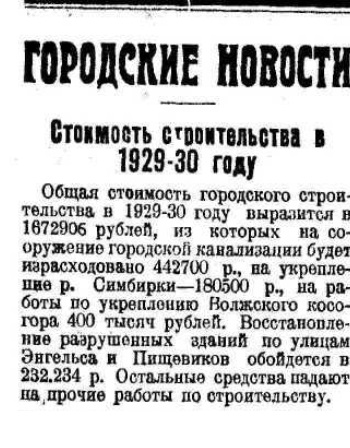 Общая стоимость городского строительства в 1929-30 гг. выразится в 1672906 рублей, из которых на сооружение городской канализации будет израсходовано 442700 р., на укрепление р. Симбирки - 180500 р., на работы по укреплению Волжского косогора 400 тысяч рублей. Восстановление разрушенных зданий по улицам Энгельса и Пищевиков обойдется в 232.234 р. Остальные средства падают на прочие работы по строительству.