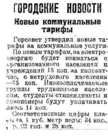 Горсовет утверждает новые тарифы за коммунальные услуги. По новым тарифам за электроэнергию будет взиматься с организованного населения и учреждений 15 коп. на киловат-час, с нетрудового населения - 5 коп. Низкооплачиваемые группы населения, студенты-стипендиаты и пенсионеры будут уплачивать лишь 11 коп.
