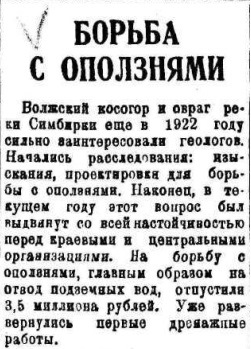 Волжский косогор и овраг реки Симбирки еще в 1922 году сильно заинтересовал геологов. Начались расследования: изыскания, проектировки для борьбы с оползнями. Наконец, в текущем году этот вопрос был выдвинут со всей настойчивостью перед краевыми и центральными организациями. На борьбу с оползнями, главным образом для отвода подземных вод, отпустили 3,5 миллиона рублей. Уже развернулись первые дренажные работы.