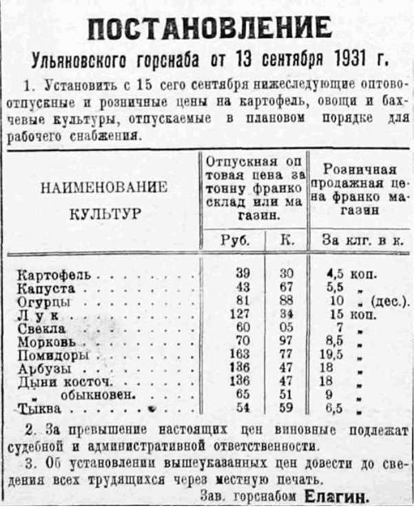 С 15 сентября 1931 года устанавливались такие цены на овощи.